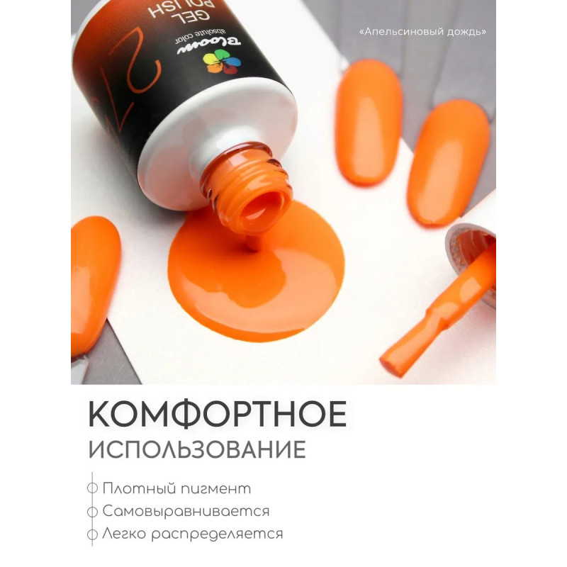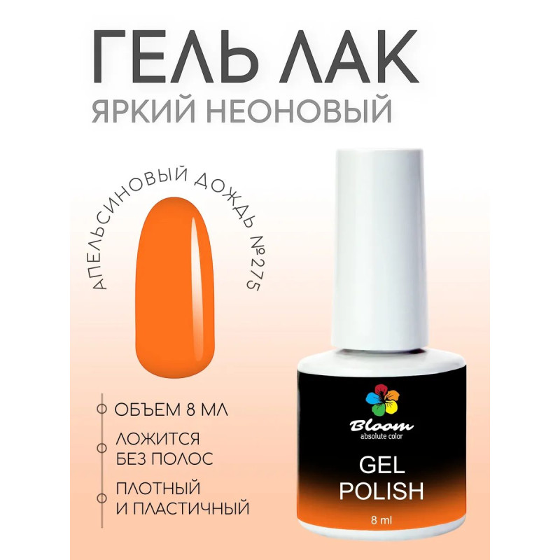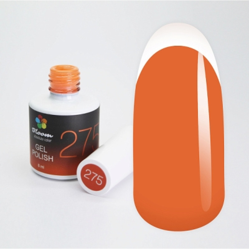 Гель-лак Bloom Апельсиновый дождь (№275) 8 мл. 90% оттенков имеют плотный стабильный пигмент. Каучуковая основа, пластичные. Сочетаются с базами и топами других фирм. Средняя консистенция, не текут. Имеют остаточную липкость. Сушить в УФ 2 минуты, в ЛЕД 1 минуту.