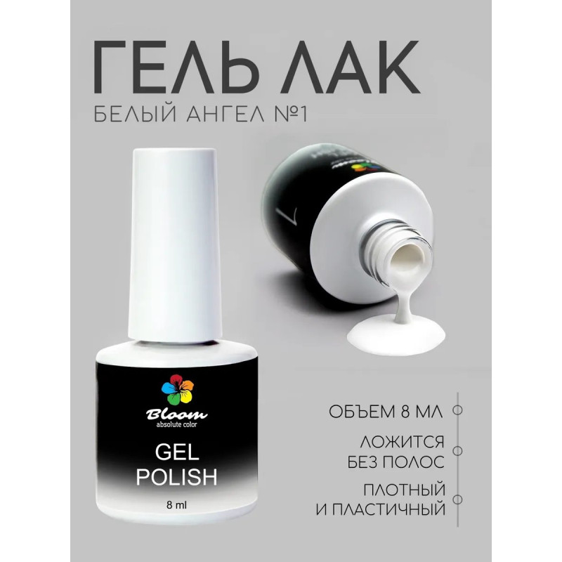 Гель-лак Bloom Белый Ангел (№1) 8 мл. 90% оттенков имеют плотный стабильный пигмент. Каучуковая основа, пластичные. Сочетаются с базами и топами других фирм.