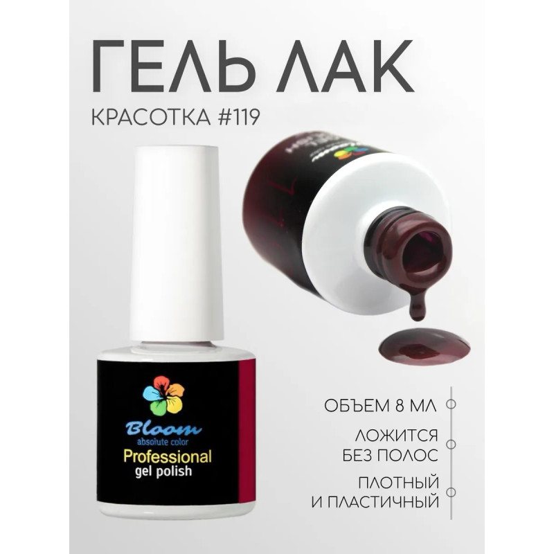 Гель-лак Bloom Красотка (№119) 8 мл. 90% оттенков имеют плотный стабильный пигмент. Каучуковая основа, пластичные. Сочетаются с базами и топами других фирм.