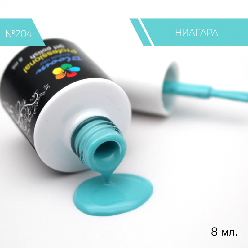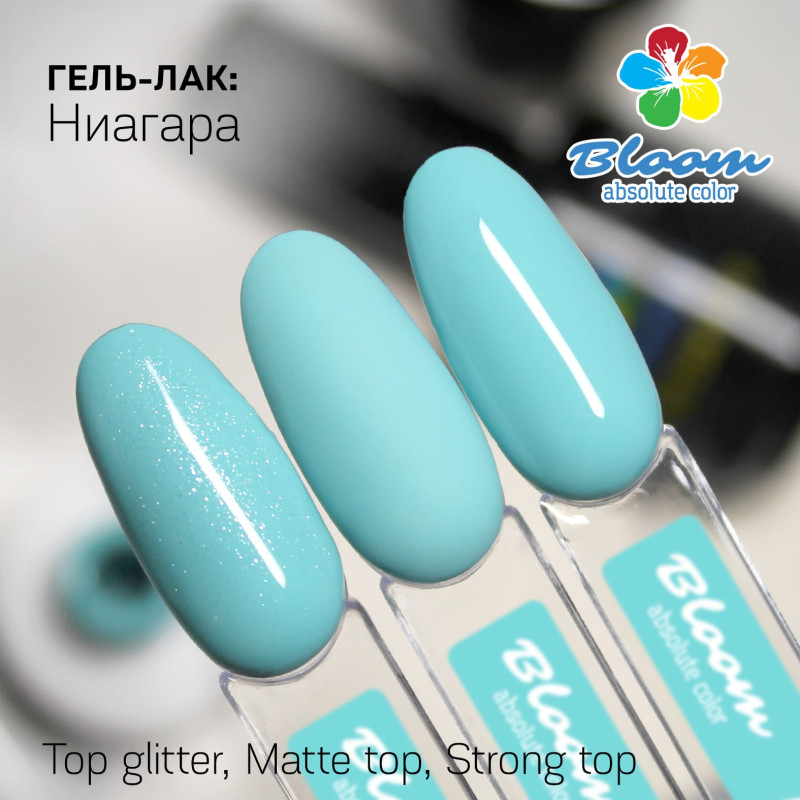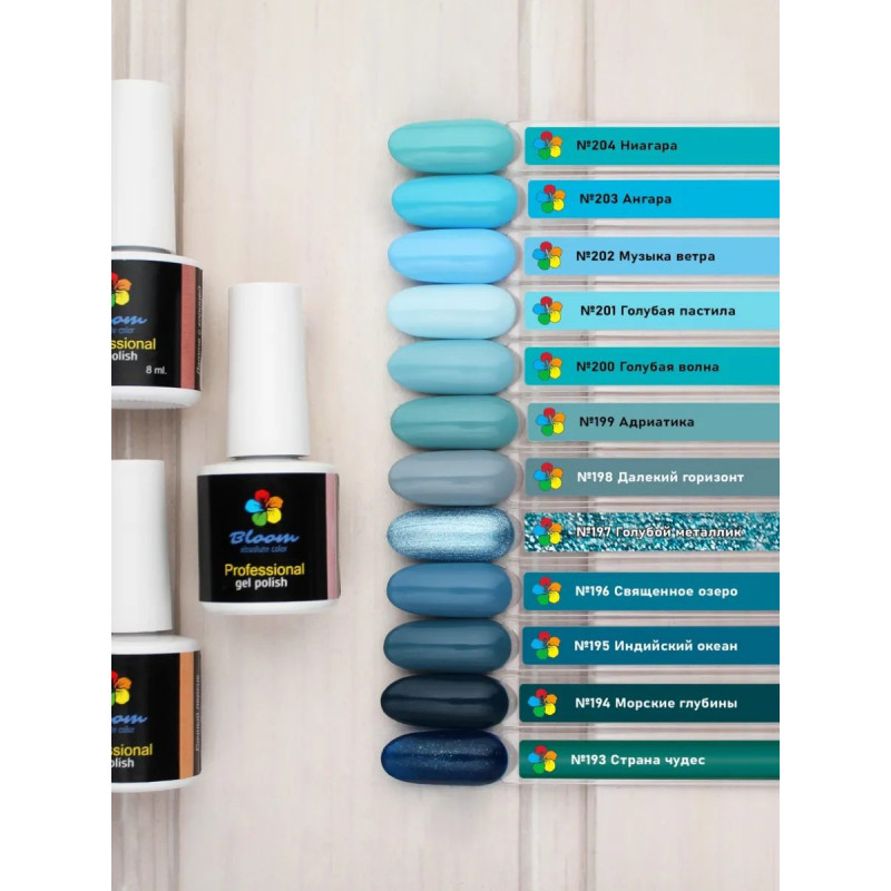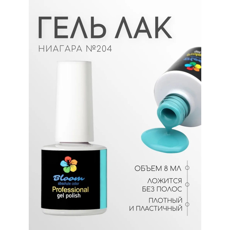 Гель-лак Bloom Ниагара (№204) объёмом 8 мл. 90% оттенков имеют плотный стабильный пигмент. Каучуковая основа, пластичные. Сочетаются с базами и топами других фирм.
