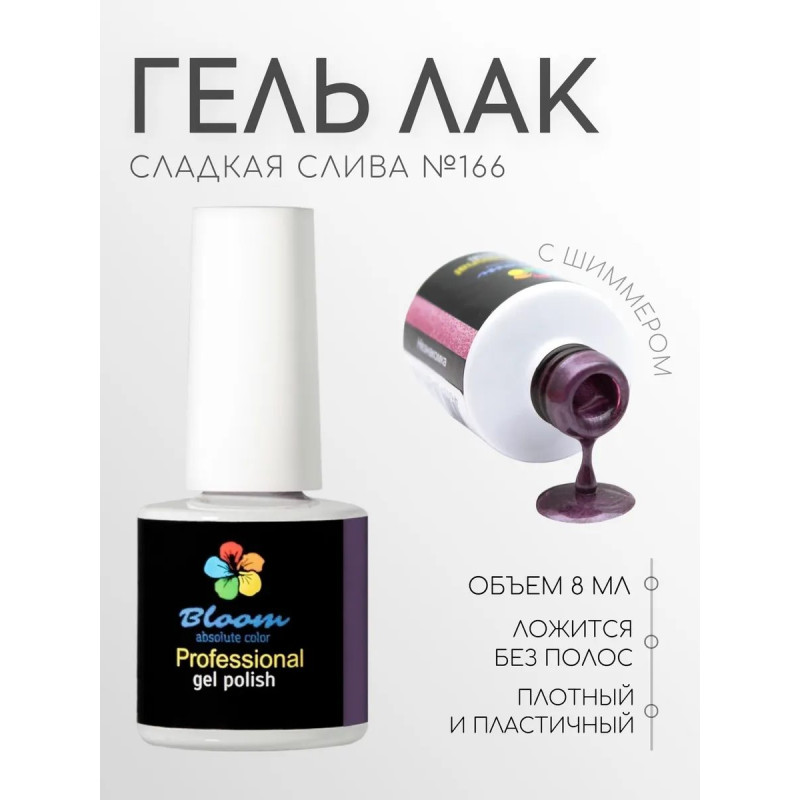 Гель-лак Bloom Сладкая слива (№166) 8 мл. 90% оттенков имеют плотный стабильный пигмент. Каучуковая основа, пластичные. Сочетаются с базами и топами других фирм. Средняя консистенция, не текут. Имеют остаточную липкость. Сушить в УФ 2 минуты, в ЛЕД 1 минуту.
