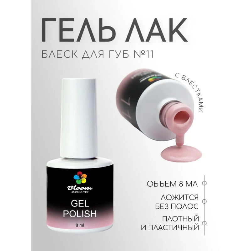 Гель-лак Bloom Блеск для губ (№11) 8 мл. 90% оттенков имеют плотный стабильный пигмент. Каучуковая основа, пластичные. Сочетаются с базами и топами других фирм.