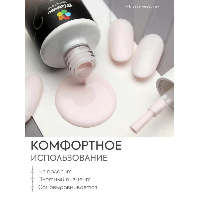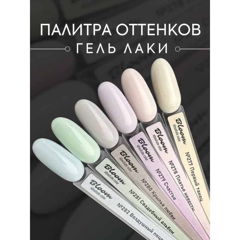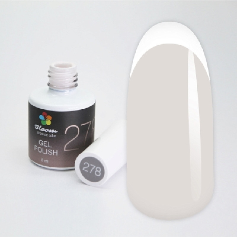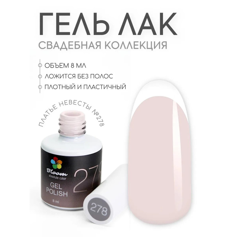 Гель-лак Bloom Платье невесты (№278) 8 мл. 90% оттенков имеют плотный стабильный пигмент, каучуковая основа, пластичные. Сочетаются с базами и топами других фирм. Средняя консистенция, не текут, имеют остаточную липкость. Сушить в УФ 2 минуты, в ЛЕД 1 минуту.