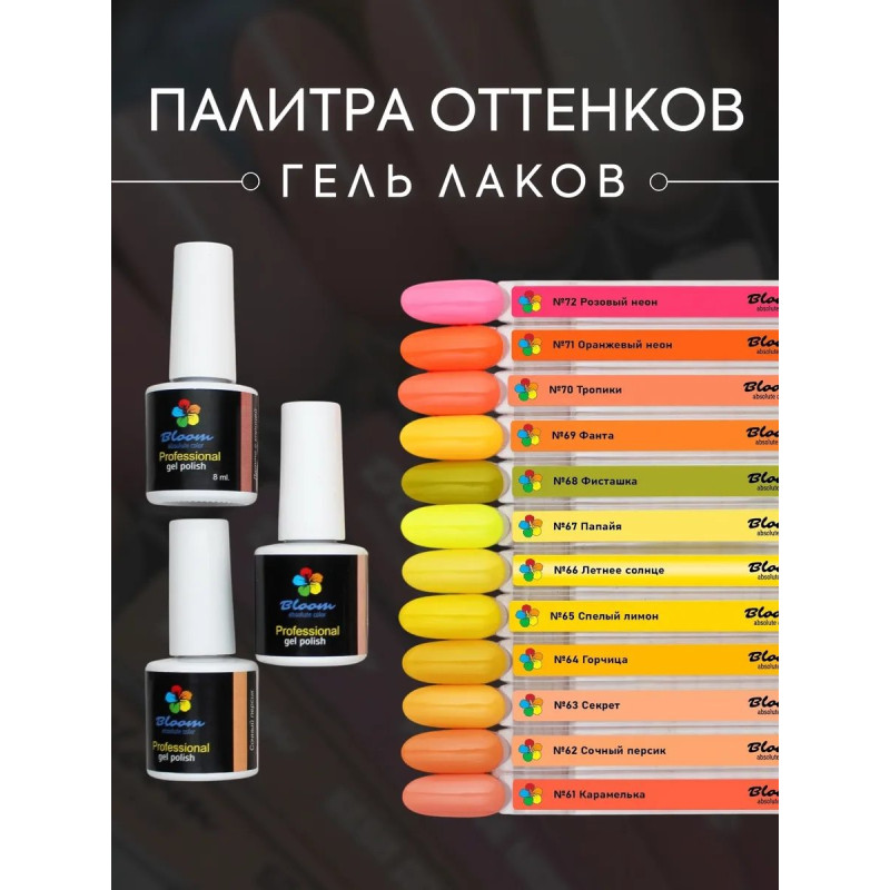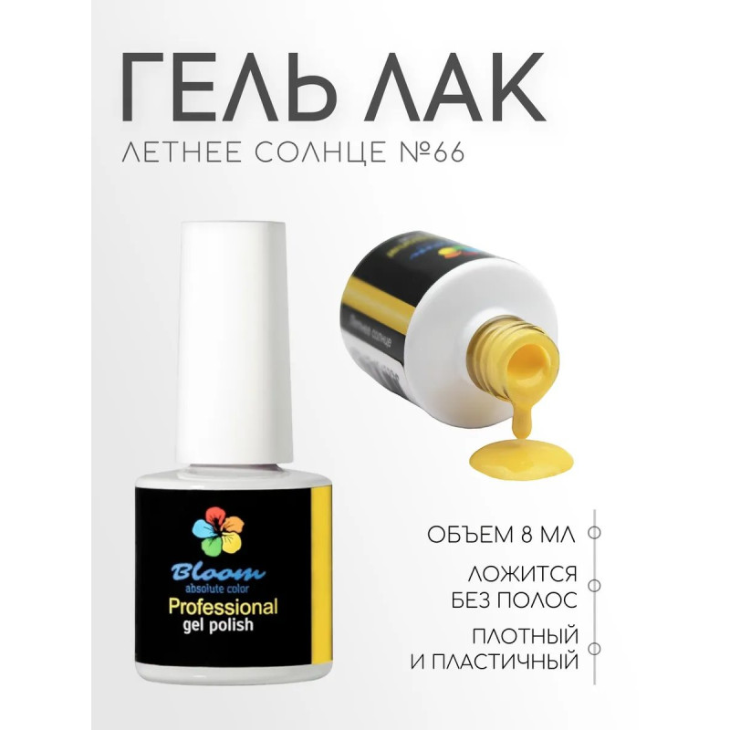Гель-лак Bloom Летнее солнце (№66) 8 мл. 90% оттенков имеют плотный стабильный пигмент. Каучуковая основа, пластичные. Сочетаются с базами и топами других фирм.