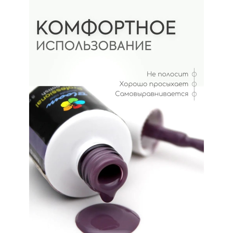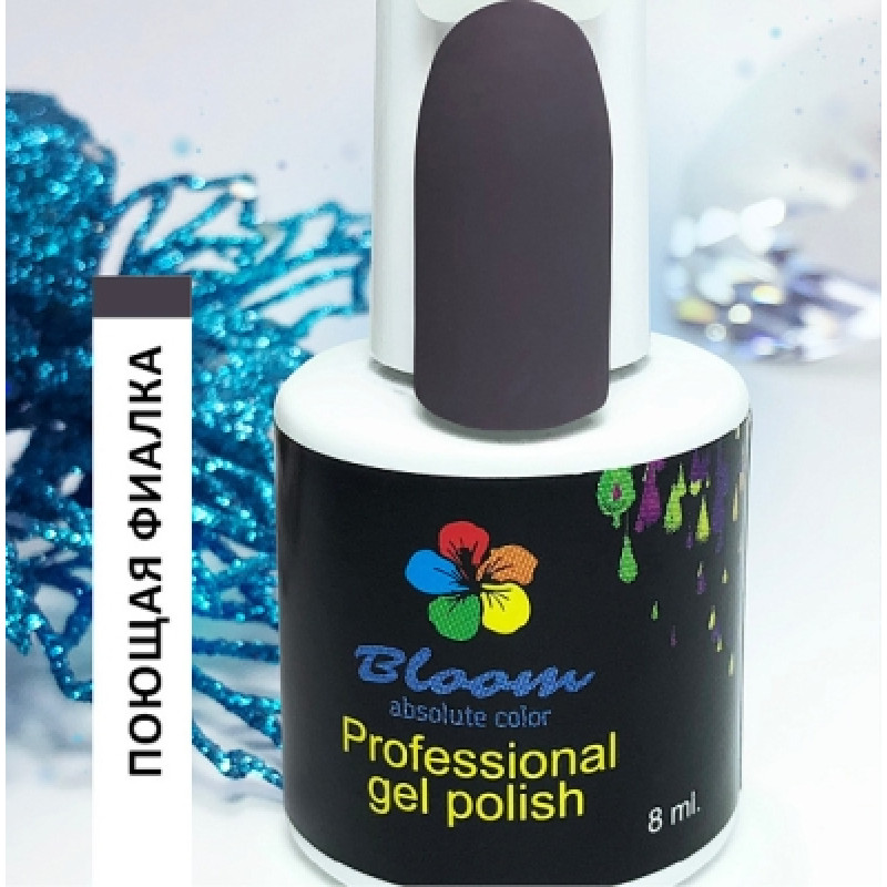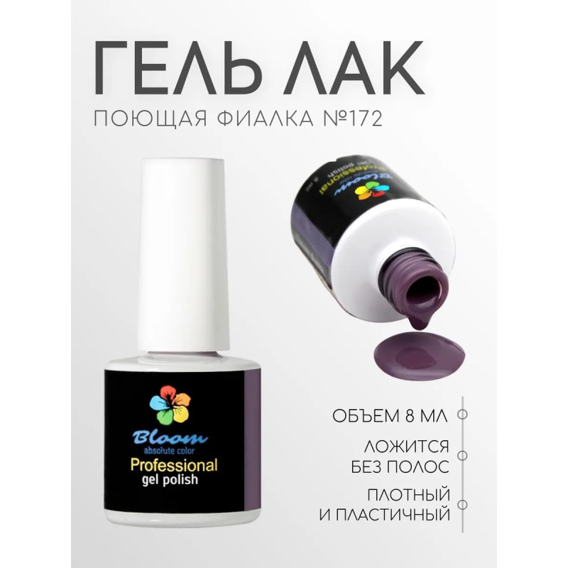 Гель-лак Bloom Поющая фиалка (№172) 8 мл. 90% оттенков имеют плотный стабильный пигмент. Каучуковая основа, пластичные. Сочетаются с базами и топами других фирм. Средняя консистенция, не текут. Имеют остаточную липкость. Сушить в УФ 2 минуты, в ЛЕД 1 минуту.