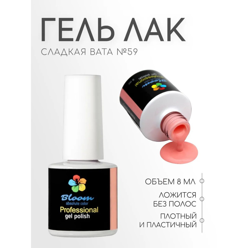 Гель-лак Bloom Сладкая вата (№59) 8 мл. 90% оттенков имеют плотный стабильный пигмент. Каучуковая основа, пластичные. Сочетаются с базами и топами других фирм.