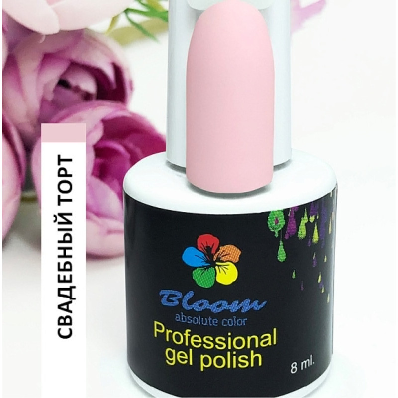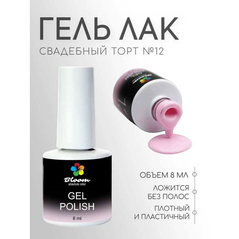 Гель-лак Bloom Свадебный торт (№12) 8 мл. 90% оттенков имеют плотный стабильный пигмент. Каучуковая основа, пластичные. Сочетаются с базами и топами других фирм.