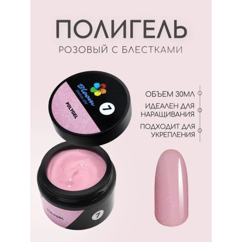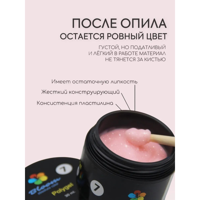 Полигель светло-розовый с блестками — густой, но податливый и лёгкий в работе материал, не тянется за кистью. Имеет консистенцию пластилина и остаточную липкость, после опила остается ровный цвет без белых точек. Подходит для моделирования и ремонта ногтей, восстановления архитектуры натуральных ногтей, а также для наращивания на верхних формах.