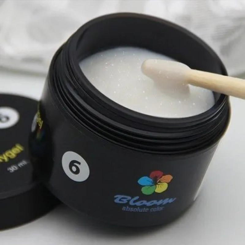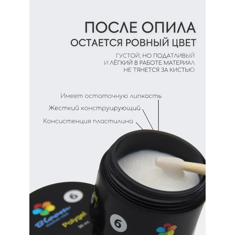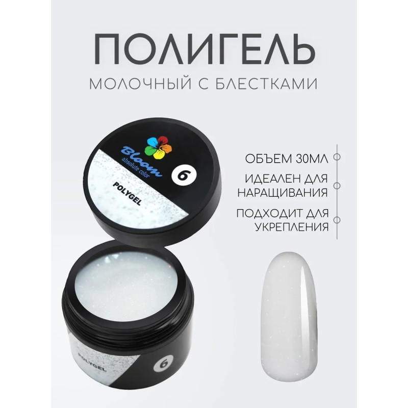 Полигель Bloom 30 мл №06 МОЛОЧНЫЙ с блестками — густой, но податливый и лёгкий в работе материал, не тянется за кистью. Имеет консистенцию пластилина и остаточную липкость. Крепкий, как акрил, без сколов и трещин, после опила остается ровный цвет без белых точек.