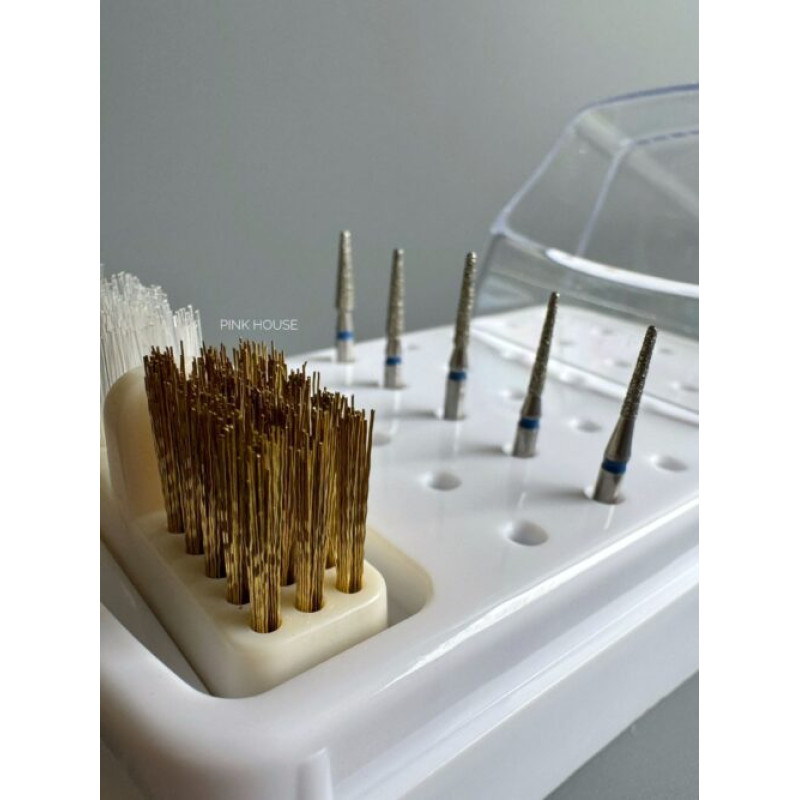 В комплекте двухсторонняя щетка с клеевой основой для бережной очистки фрезы.