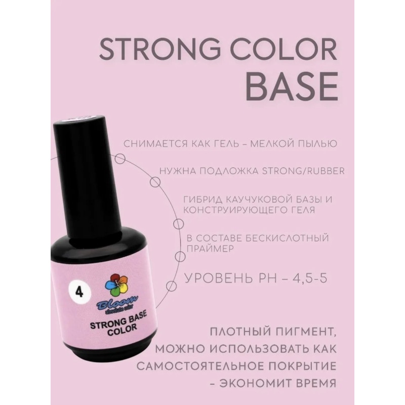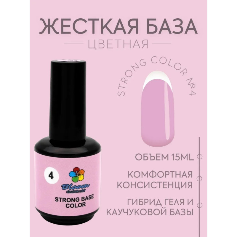 Гель-лак Bloom база 15мл Strong Color 04 — это жесткая камуфлирующая база, сочетающая свойства каучуковой основы и конструирующего геля. Покрытие имеет густую консистенцию, плохо растворяется и подходит для тонких и ломких ногтей, эффективно скрывая дефекты ногтевой пластины.