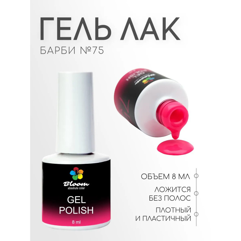 Гель-лак Bloom Барби (№75) 8 мл. 90% оттенков имеют плотный стабильный пигмент. Каучуковая основа, пластичные. Сочетаются с базами и топами других фирм.