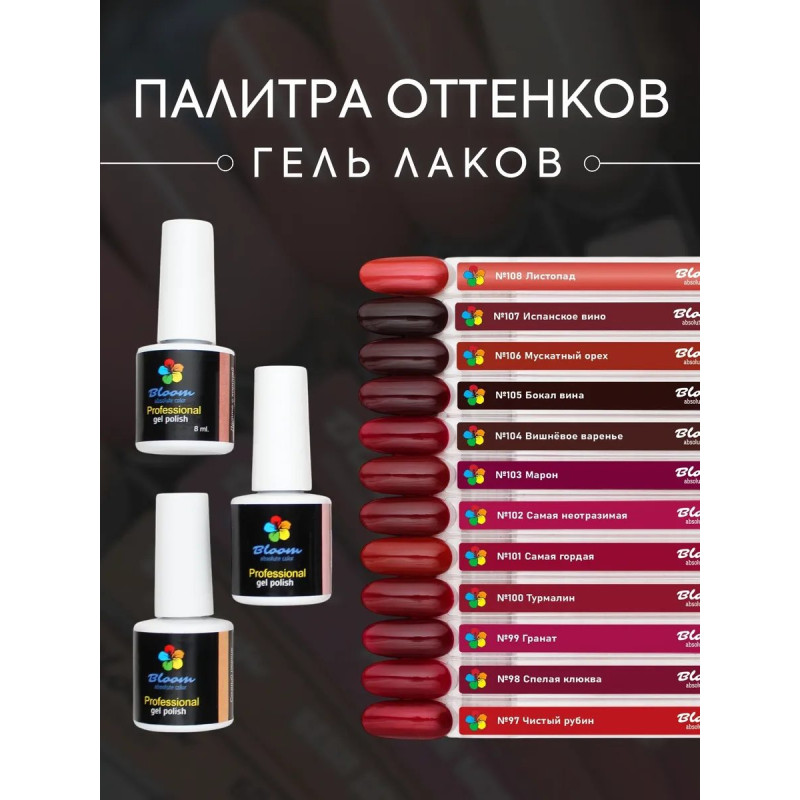 Гель-лак Bloom Бокал вина (№105) 8 мл. 90% оттенков имеют плотный стабильный пигмент. Каучуковая основа, пластичные. Сочетаются с базами и топами других фирм.