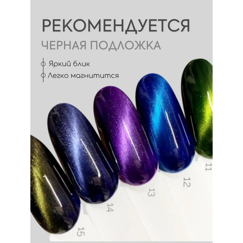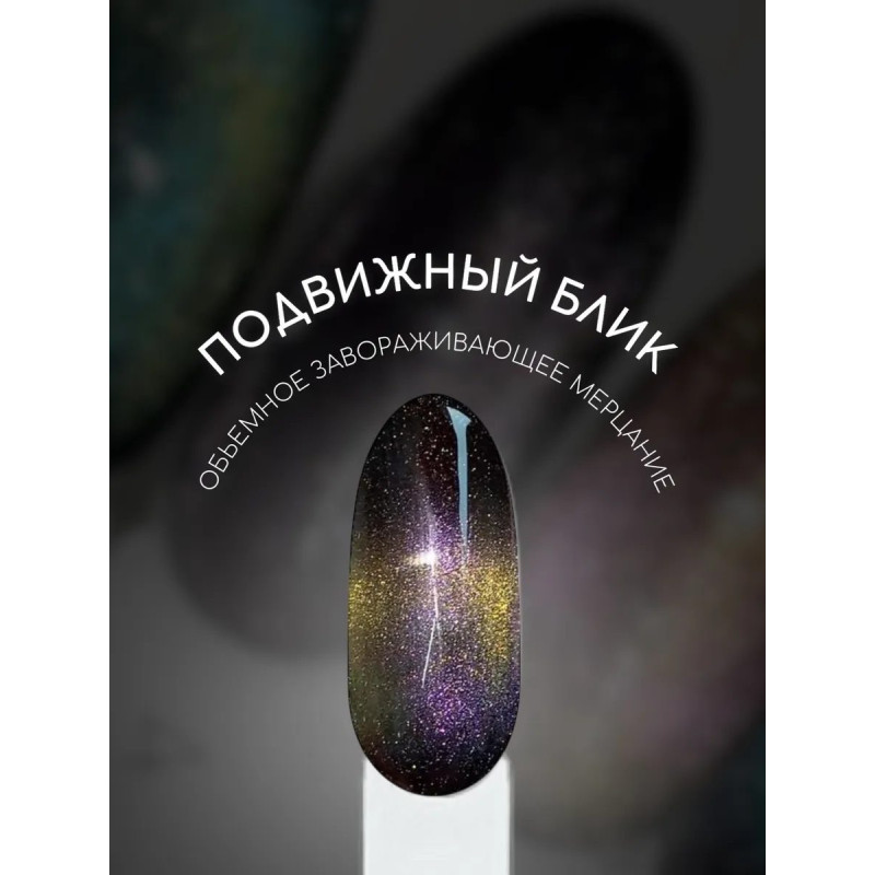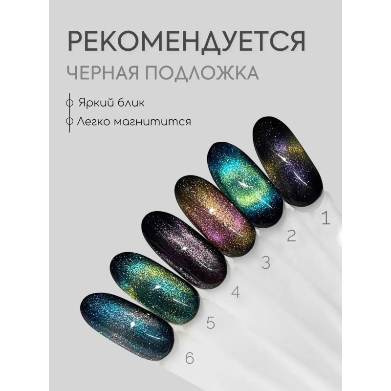 Яркие переливающиеся оттенки наносятся на черную подложку. Для создания эффекта требуется магнит. Полимеризация: 2 минуты в УФ-лампе или 1 минута в LED-лампе.