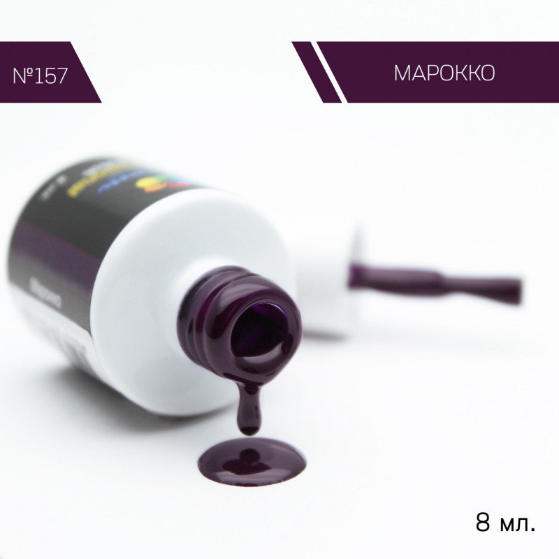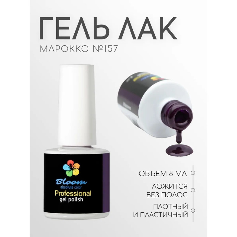 Гель-лак Bloom Марокко (№157) 8 мл. 90% оттенков имеют плотный стабильный пигмент. Каучуковая основа, пластичные. Сочетаются с базами и топами других фирм. Средняя консистенция, не текут. Имеют остаточную липкость. Сушить в УФ 2 минуты, в ЛЕД 1 минуту.