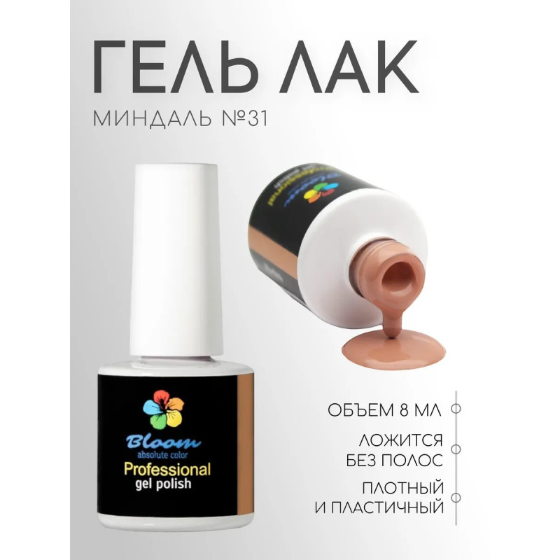 Гель-лак Bloom Миндаль (№31) 8 мл. 90% оттенков имеют плотный стабильный пигмент. Каучуковая основа, пластичные. Сочетаются с базами и топами других фирм. Средняя консистенция, не текут. Имеют остаточную липкость. Сушить в УФ 2 минуты, в ЛЕД 1 минуту.