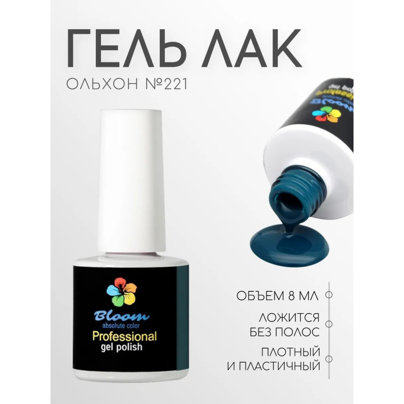 Гель-лак Bloom Ольхон (№221) 8 мл. 90% оттенков имеют плотный стабильный пигмент. Каучуковая основа, пластичные. Сочетаются с базами и топами других фирм.