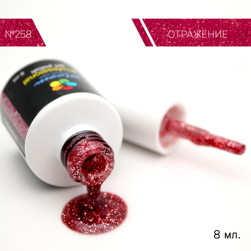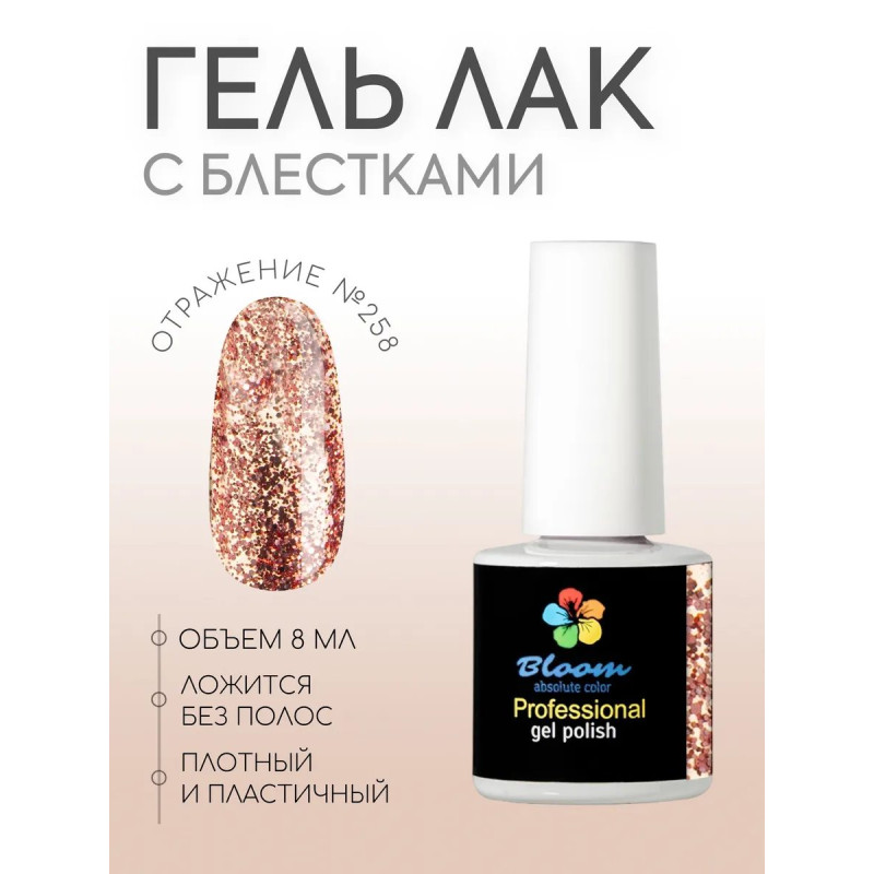Гель-лак Bloom Отражение (№258) 8 мл. 90% оттенков имеют плотный стабильный пигмент. Каучуковая основа, пластичные. Сочетаются с базами и топами других фирм. Средняя консистенция, не текут. Имеют остаточную липкость. Сушить в УФ 2 минуты, в ЛЕД 1 минуту.