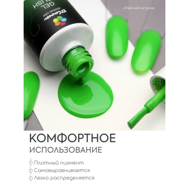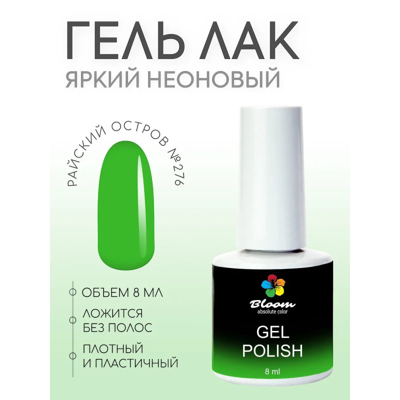 Плотный гель-лак Bloom №276 «Райский остров» — неоновый зеленый оттенок, который ложится в один слой. Он устойчив к сколам, отслоениям и выгоранию на солнце, сохраняя насыщенный цвет. Гель-лак пластичный, подходит для маникюра и педикюра, имеет удобный флакон с кистью для ровного нанесения.