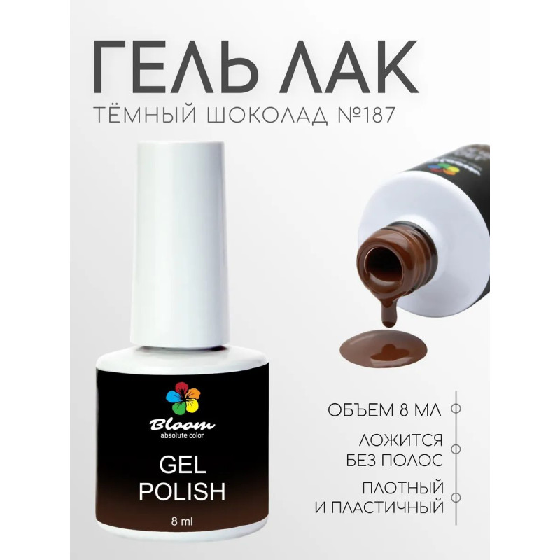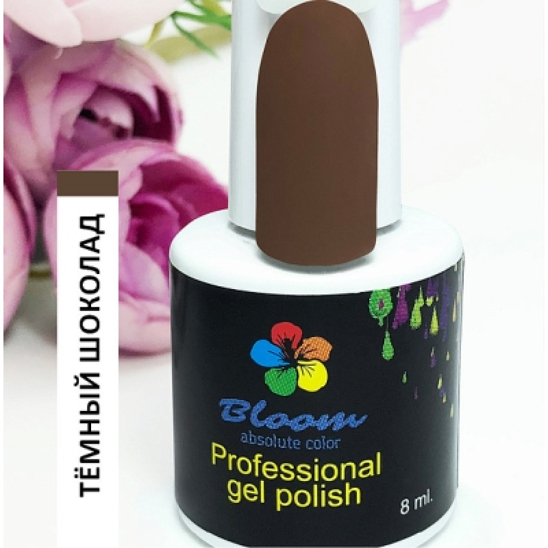 Гель-лак Bloom Темный шоколад (№187) 8 мл. 90% оттенков имеют плотный стабильный пигмент. Каучуковая основа, пластичные. Сочетаются с базами и топами других фирм.