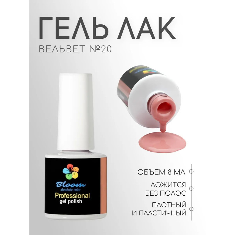 Гель-лак Bloom Вельвет (№20) 8 мл. 90% оттенков имеют плотный стабильный пигмент. Каучуковая основа, пластичные. Сочетаются с базами и топами других фирм.