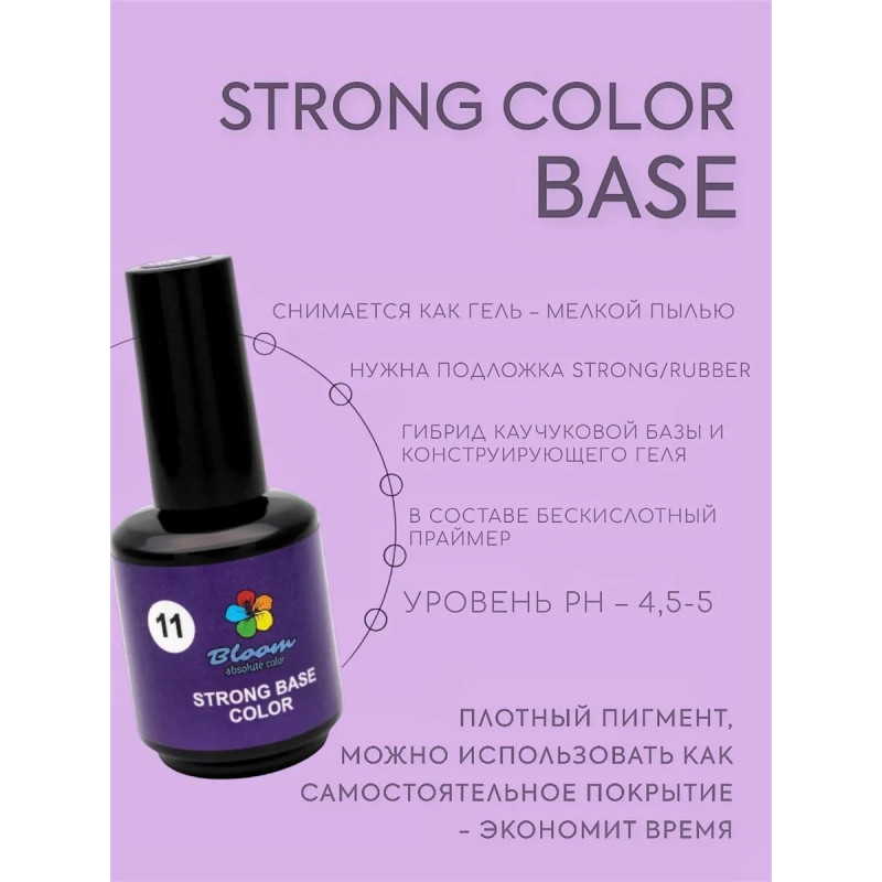 Гель-лак Bloom база 15мл Strong Color 11 — это жесткая камуфлирующая база, сочетающая свойства каучуковой основы и конструирующего геля. Имеет густую консистенцию, плохо растворяется и подходит для тонких и ломких ногтей, эффективно скрывая дефекты ногтевой пластины.