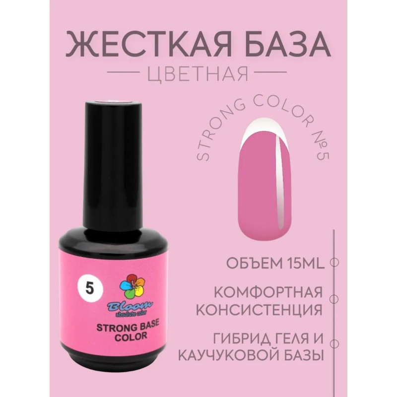 Гель-лак Bloom база 15мл Strong Color 05 — это жесткая камуфлирующая база, сочетающая в себе свойства каучуковой основы и конструирующего геля. Покрытие имеет густую консистенцию, плохо растворяется и подходит для тонких и ломких ногтей, эффективно скрывая дефекты ногтевой пластины.