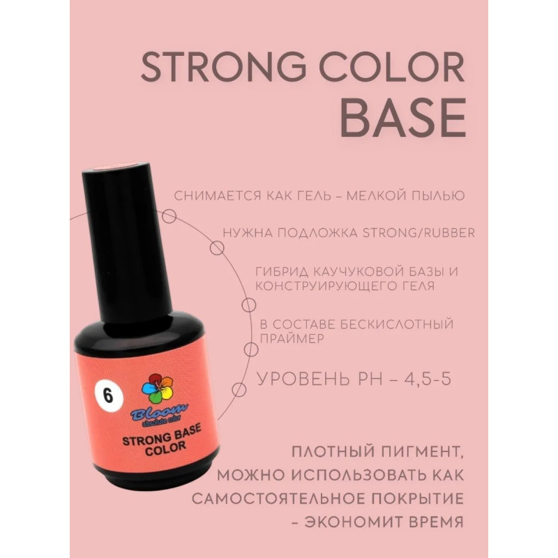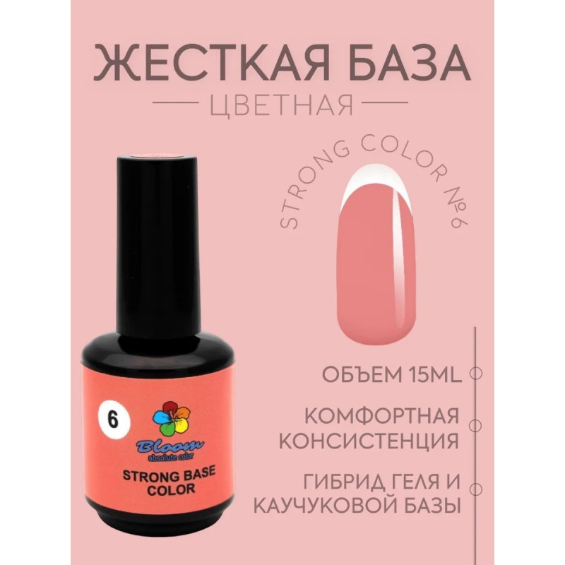 Гель-лак Bloom база 15мл Strong Color 06 — жесткая камуфлирующая база, сочетающая свойства каучуковой основы и конструирующего геля. Имеет густую консистенцию, плохо растворяется. Подходит для тонких и ломких ногтей, эффективно скрывает дефекты ногтевой пластины.