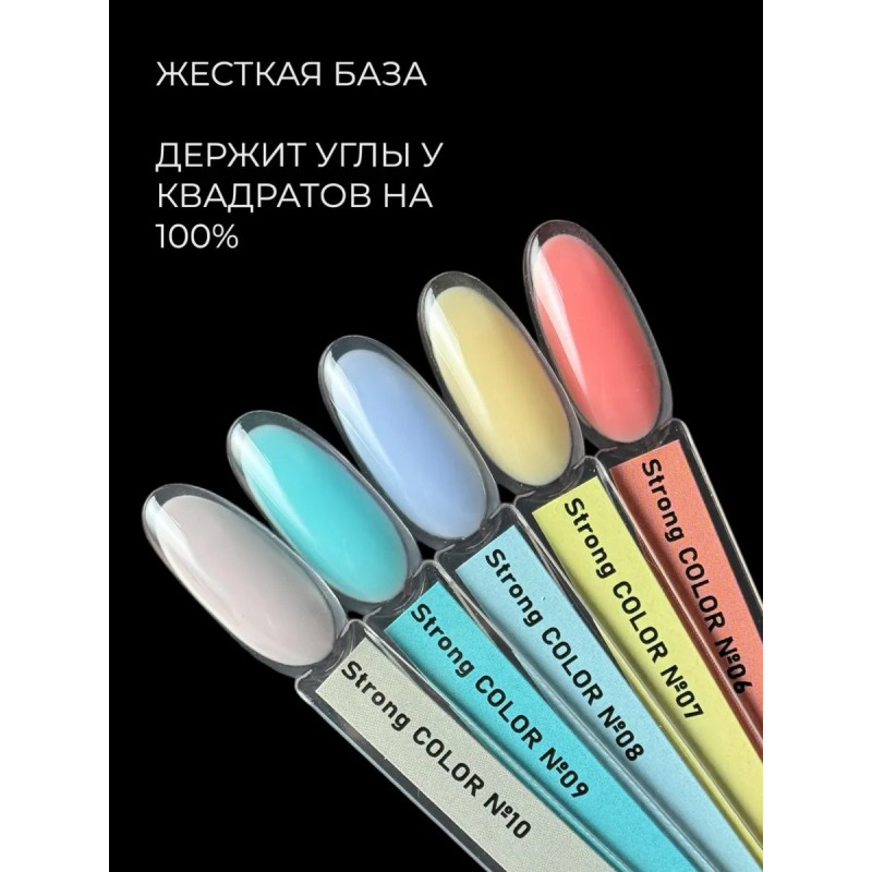 Базу следует наносить на подложку из прозрачной базы Стронг или Руббер. Сушить в УФ 2 минуты, ЛЕД 1 минуту. Снимается как гель – мелкой пылью.