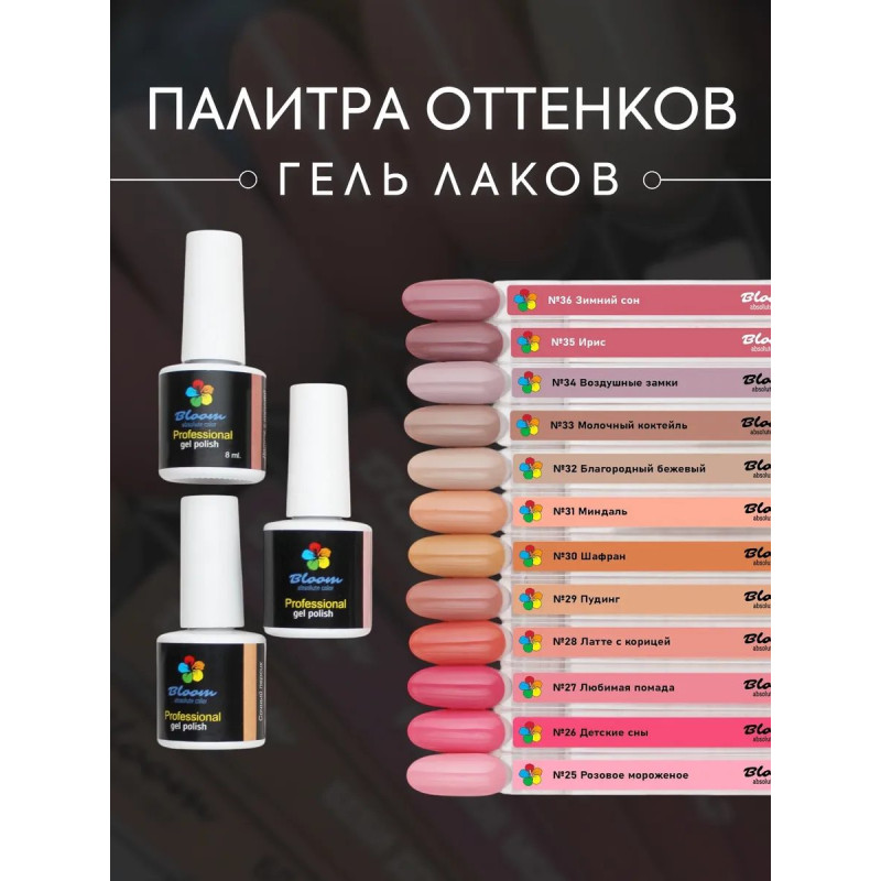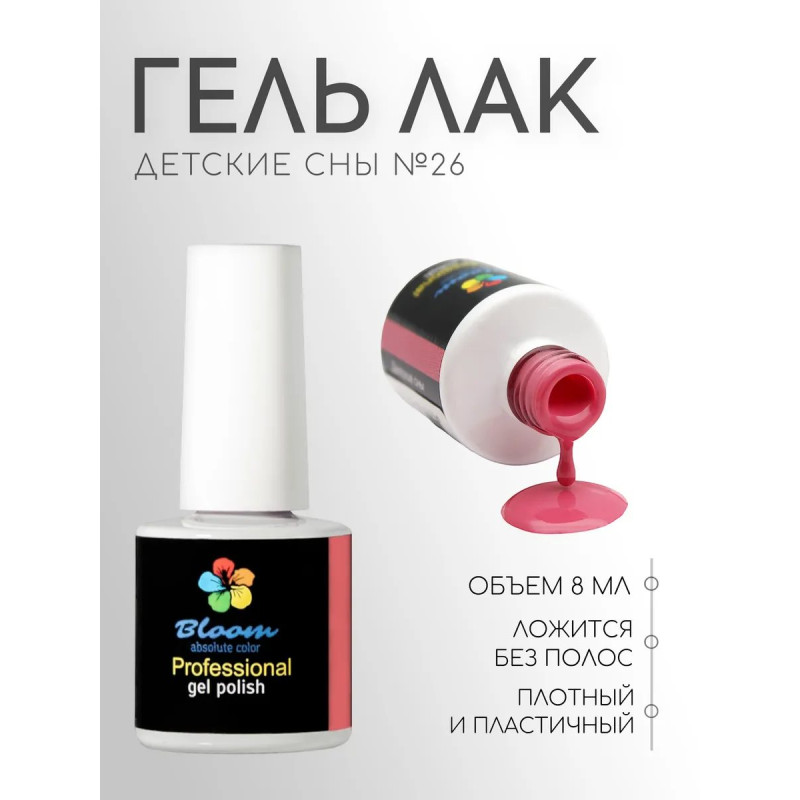 Гель-лак Bloom Детские сны (№26) 8 мл. 90% оттенков имеют плотный стабильный пигмент. Каучуковая основа, пластичные. Сочетаются с базами и топами других фирм. Средняя консистенция, не текут. Имеют остаточную липкость. Сушить в УФ 2 минуты, в ЛЕД 1 минуту.