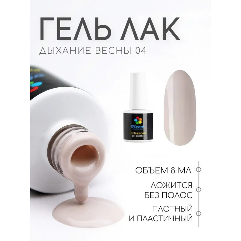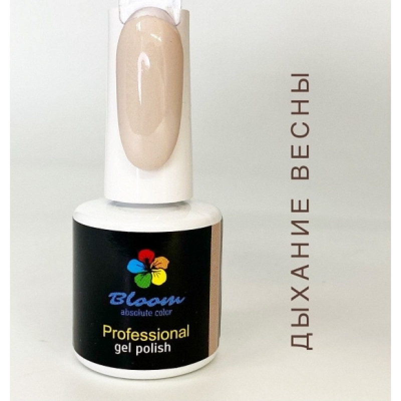 Гель-лак Bloom Дыхание весны (№4) 8 мл. 90% оттенков имеют плотный стабильный пигмент. Каучуковая основа, пластичные. Сочетаются с базами и топами других фирм. Средняя консистенция, не текут. Имеют остаточную липкость. Сушить в УФ 2 минуты, в ЛЕД 1 минуту.
