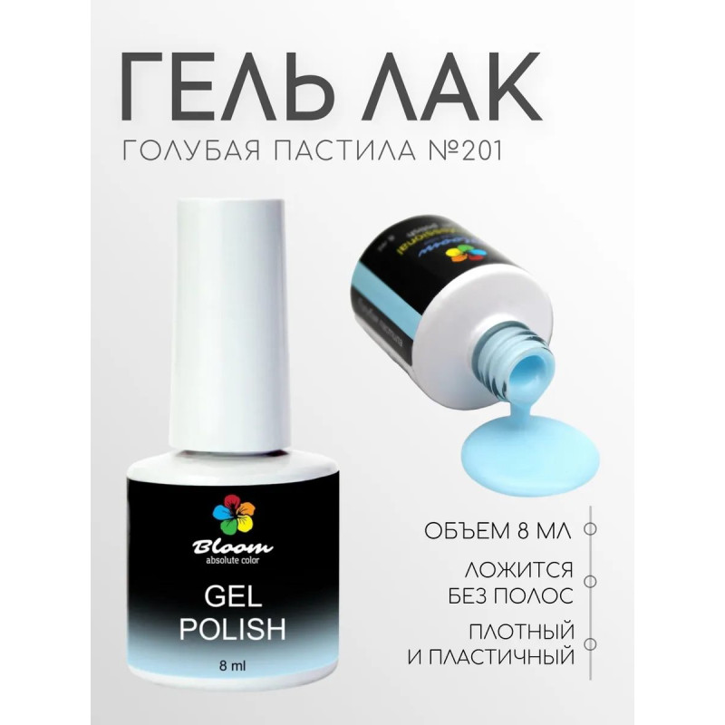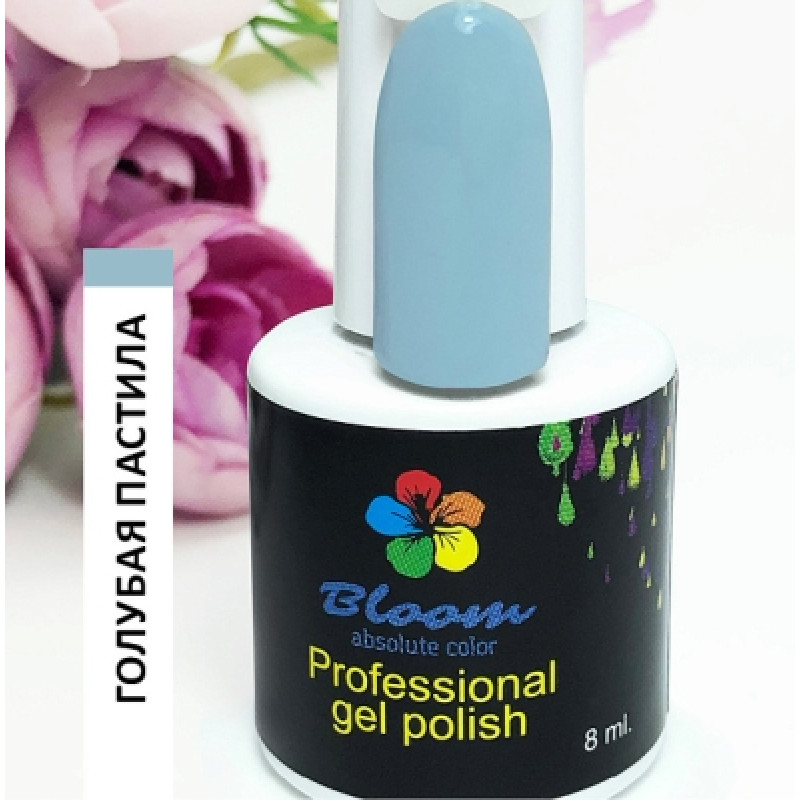 Гель-лак Bloom Голубая пастила (№201) 8 мл. 90% оттенков имеют плотный стабильный пигмент. Каучуковая основа, пластичные. Сочетаются с базами и топами других фирм.