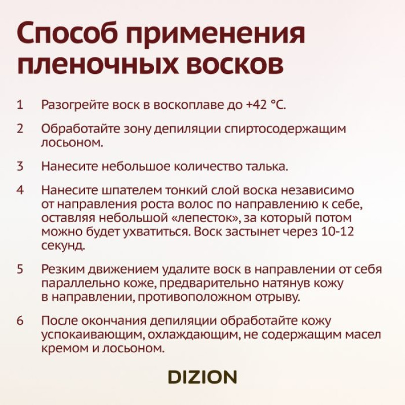 Воски работают при температуре +42°С, что исключает возможность ожога. Они снимаются без полоски, удаляя волоски с корешками и не оставляя обломанных волос, раздражений и покраснений. Средство экономично в использовании и рекомендовано как для домашней эпиляции, так и для салонов.