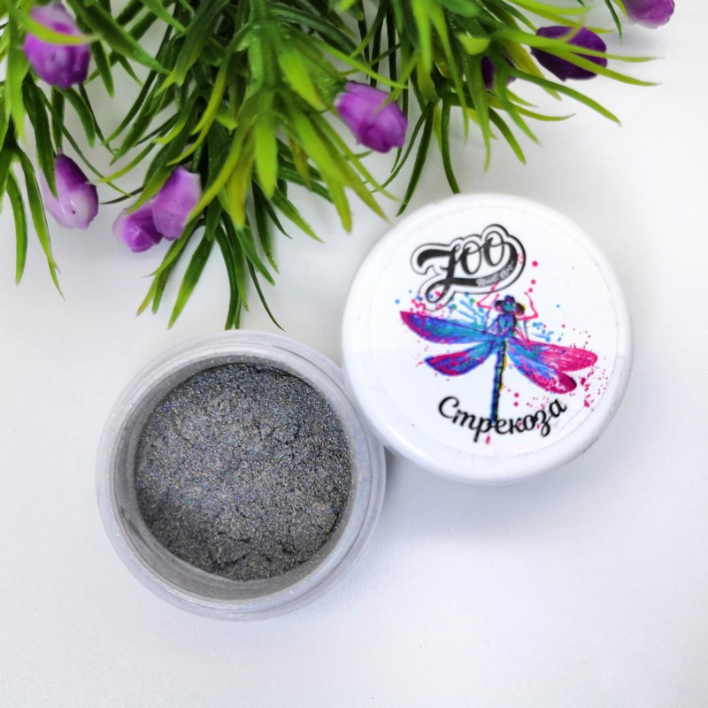 Втирка ZOO "Алмазная стрекоза" 0,5 гр (1001). Ложится тонким слоем, создавая голографический эффект, но не скрывая базовый цвет, на который наносится. При покрытии топом не мутнеет и не тускнеет.