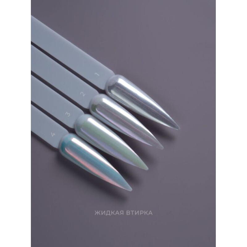 Как пользоваться: обезжирить готовый ноготь с покрытием, нанести небольшое количество втирки, подождать несколько секунд, интенсивно втереть до полного высыхания и зеркального блеска, перекрыть топом для втирки.