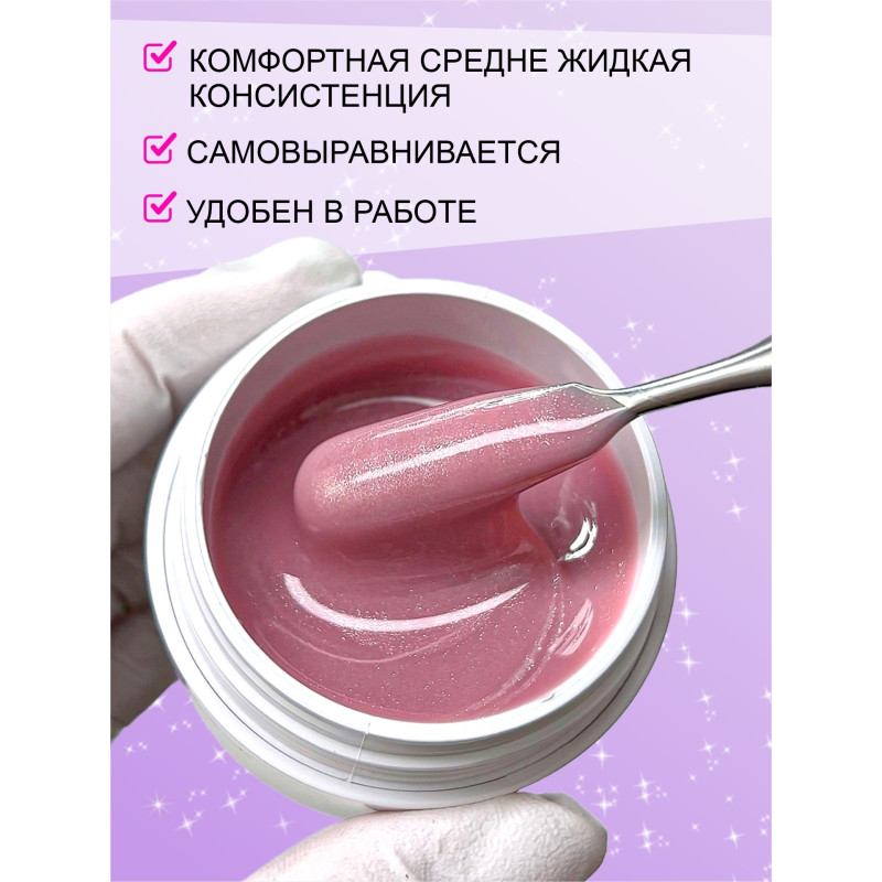 Материал обладает средне-жидкой консистенцией, легко наносится и распределяется по ногтевой пластине, не растекается. После полимеризации становится устойчивым к внешним воздействиям. Позволяет создавать натуральные и эстетичные ногти в тонком слое, которые держатся долго и не требуют частой коррекции. Обеспечивает длительную носку до 6 недель без сколов и отслоек.