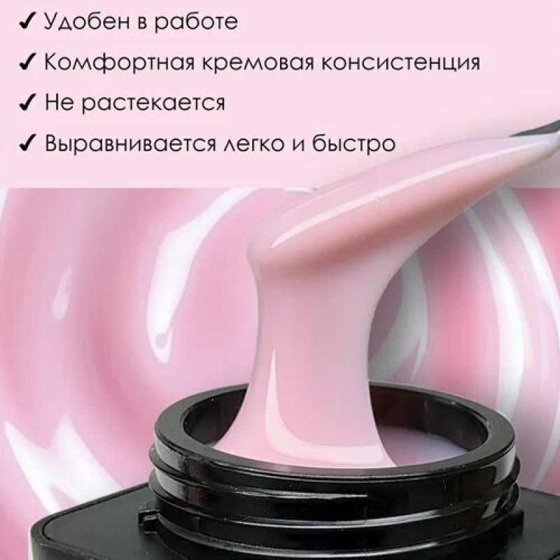 Гель для наращивания ногтей обладает средней кремовой консистенцией, что делает его послушным в работе. В тонком слое он пластичный, что позволяет избежать отслоек, а в толстом слое становится крепким и твердым, обеспечивая долговечность маникюра. Благодаря пластичности гель легко распределяется по ногтевой пластине, обеспечивая ровное и гладкое покрытие.