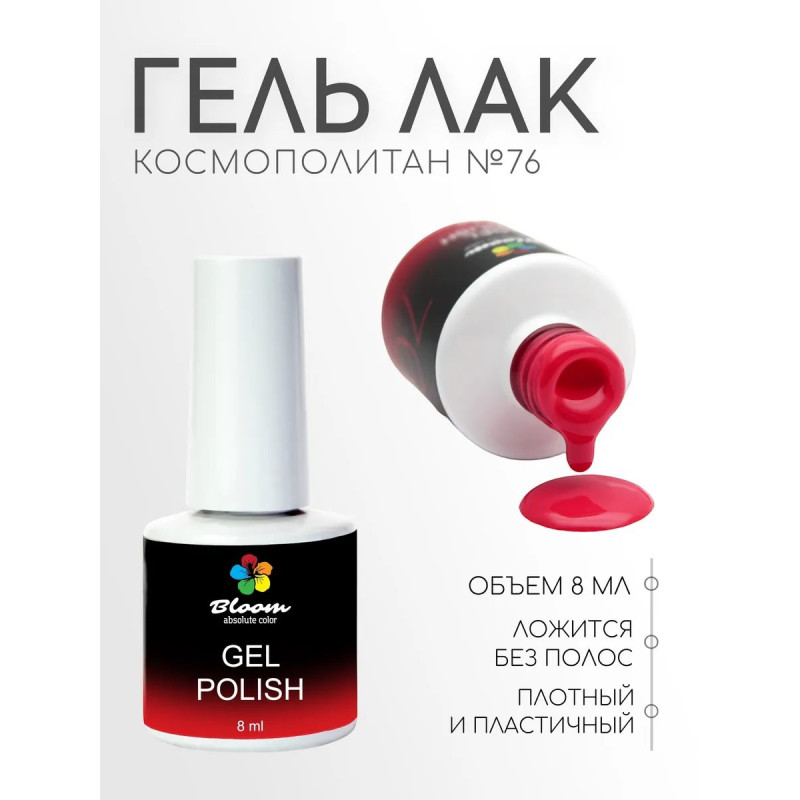 Гель-лак Bloom Космополитан (№76) 8 мл. 90% оттенков имеют плотный стабильный пигмент. Каучуковая основа, пластичные. Сочетаются с базами и топами других фирм.