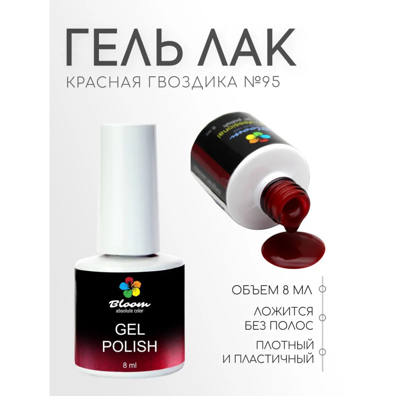 Гель-лак Bloom Красная гвоздика (№95) 8 мл. 90% оттенков имеют плотный стабильный пигмент. Каучуковая основа, пластичные. Сочетаются с базами и топами других фирм.