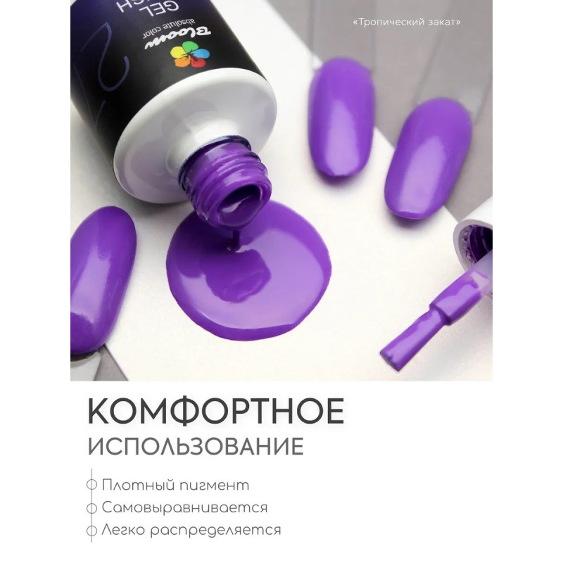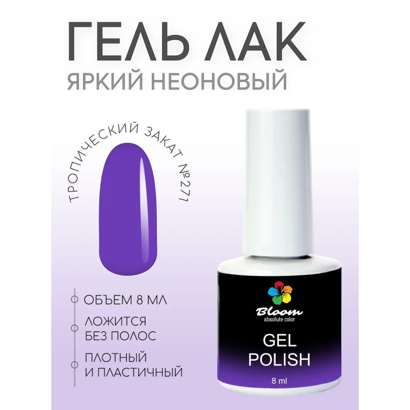 Гель-лак Bloom Тропический закат (№271) 8 мл. 90% оттенков имеют плотный стабильный пигмент. Каучуковая основа, пластичные. Сочетаются с базами и топами других фирм. Средняя консистенция, не текут. Имеют остаточную липкость. Сушить в УФ 2 минуты, в ЛЕД 1 минуту.