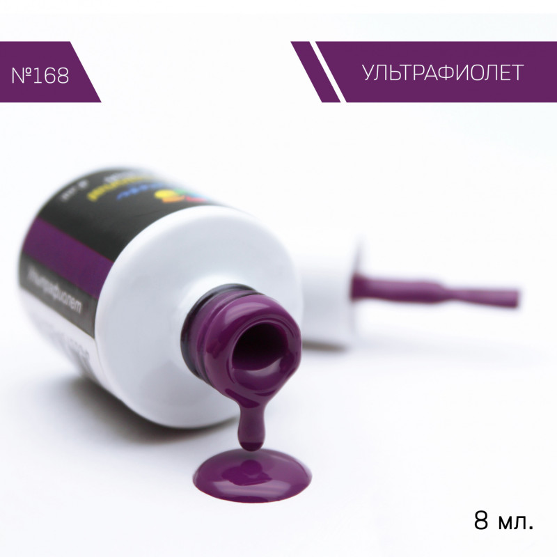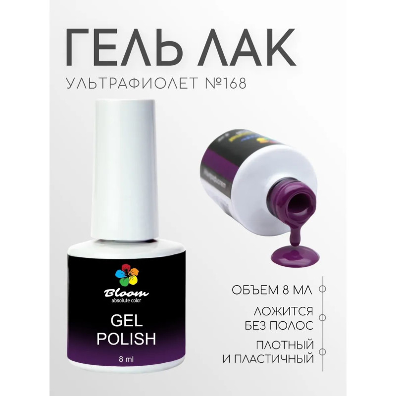 Гель-лак Bloom Ультрафиолет (№168) 8 мл. 90% оттенков имеют плотный стабильный пигмент. Каучуковая основа, пластичные. Сочетаются с базами и топами других фирм.