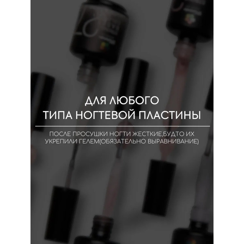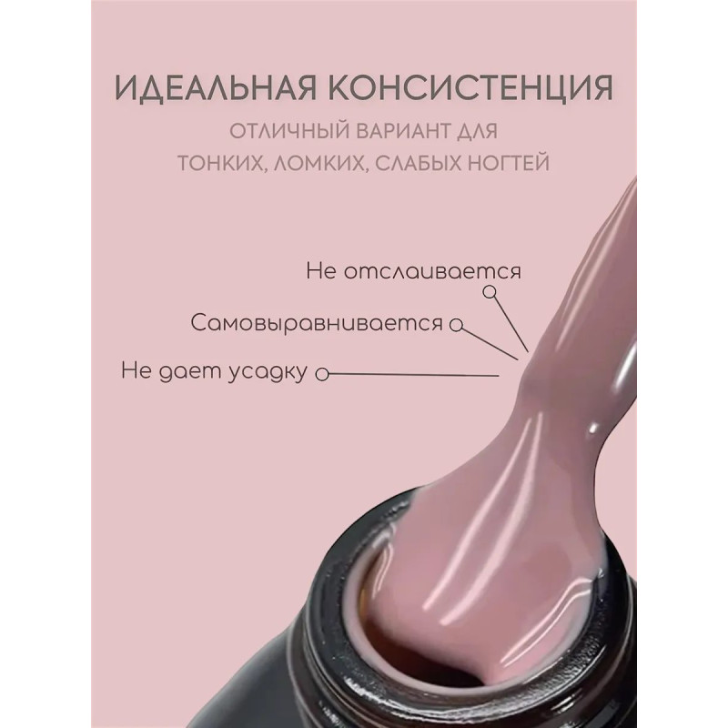 База позволяет донарастить ногти до 5 мм. Минимальная усадка во время ношения. Сушить в LED 1 минуту, в УФ 2 минуты.