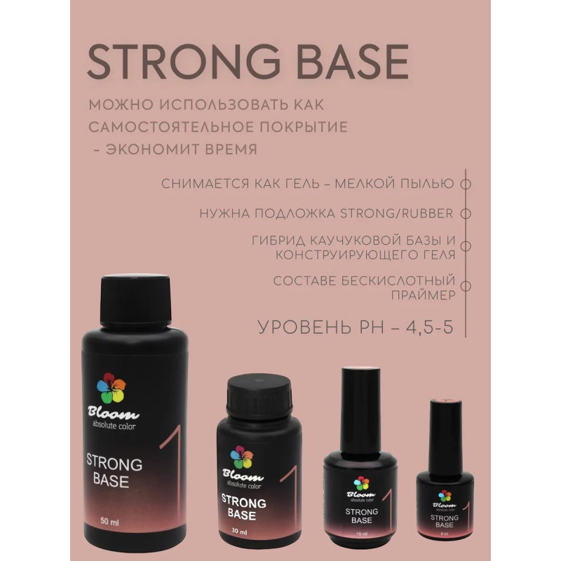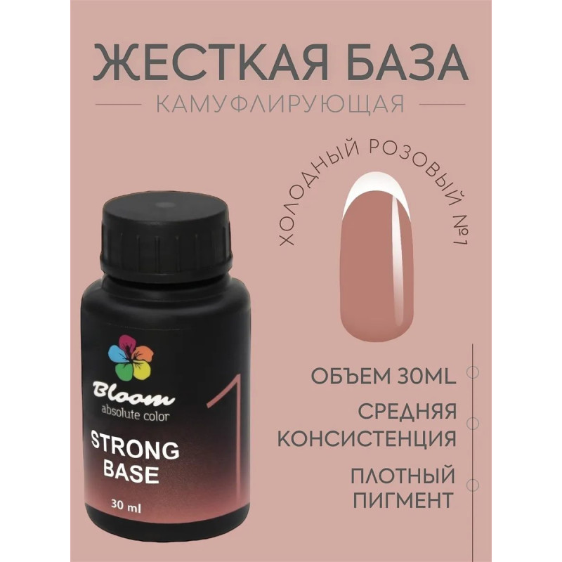 Гель-лак Bloom база 30мл жесткая 01 холодный розовый. Жесткая гибридная база для тонких и ломких ногтей (конструирующий гель+каучуковая база). Оптимальная консистенция и приятные натуральные оттенки. База позволяет донарастить ногти до 5 мм. Минимальная усадка во время ношения. Сушить в LED 1 минуту, в УФ 2 минуты.