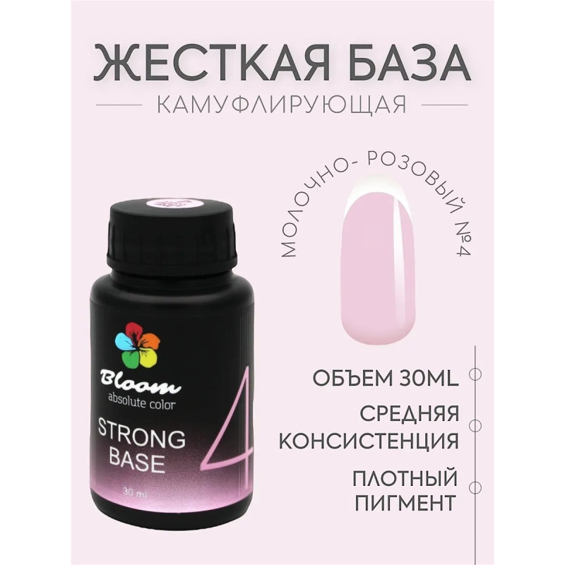 Гель-лак Bloom база 30мл жесткая 04 бледно розовый. Жесткая гибридная база для тонких и ломких ногтей (конструирующий гель+каучуковая база). Оптимальная консистенция и приятные натуральные оттенки.