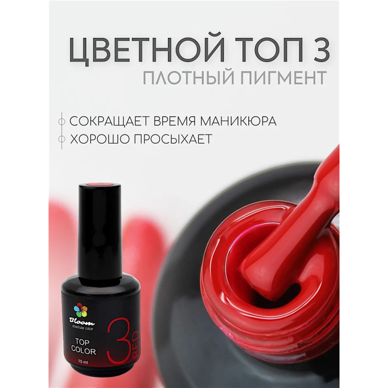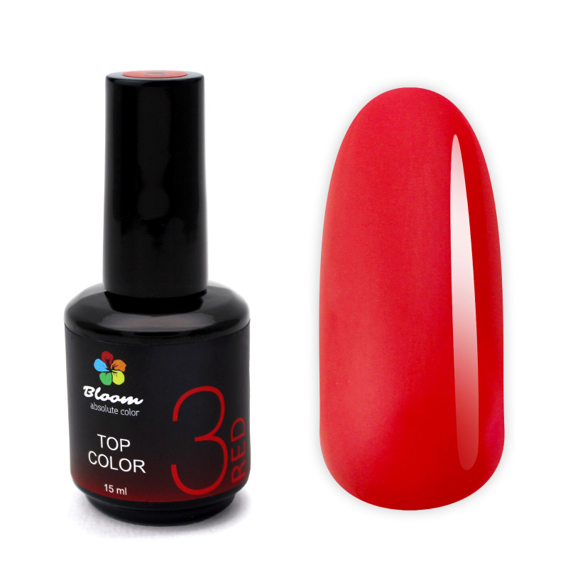 Топ Bloom COLOR №3 Красный, 15 мл. Цветной топ плотный, яркий, хорошо просыхает. Сохраняет стойкий блеск и ускоряет работу мастера. Наносится с небольшим выравниванием, не полосит и быстро выравнивается.