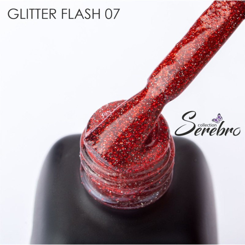 Гель-лак Serebro Glitter flash светоотражающий 07, 11 мл. Гель-лаки коллекции Glitter Flash со светоотражающими частицами обеспечивают изящный блеск с мелкой фракцией шиммера, ослепляют своим сиянием при любом освещении, как в дневное, так и в ночное время. При попадании прямого луча света ногти превращаются в настоящее волшебство. Гель-лак красного цвета с блестками мелкого помола, со светоотражающими, мерцающими частичками.