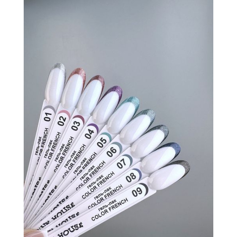 Color French – особенная серия гель-лаков. Они как-будто состоят из мельчайшей матовой фольги красивых и сложных оттенков. Настолько мелкой, что можно очень легко нарисовать тонкий четкий френч, и даже не покрывать матовым топом.
