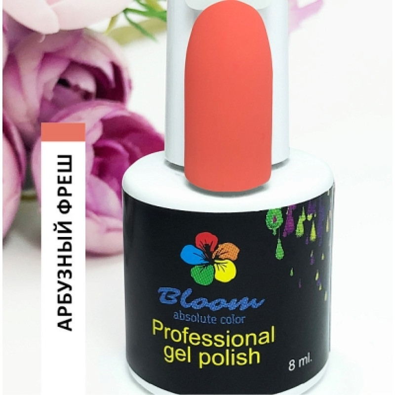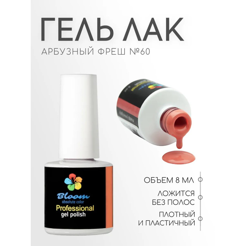 Гель-лак Bloom Арбузный фреш (№60) 8 мл. 90% оттенков имеют плотный стабильный пигмент. Каучуковая основа, пластичные. Сочетаются с базами и топами других фирм.