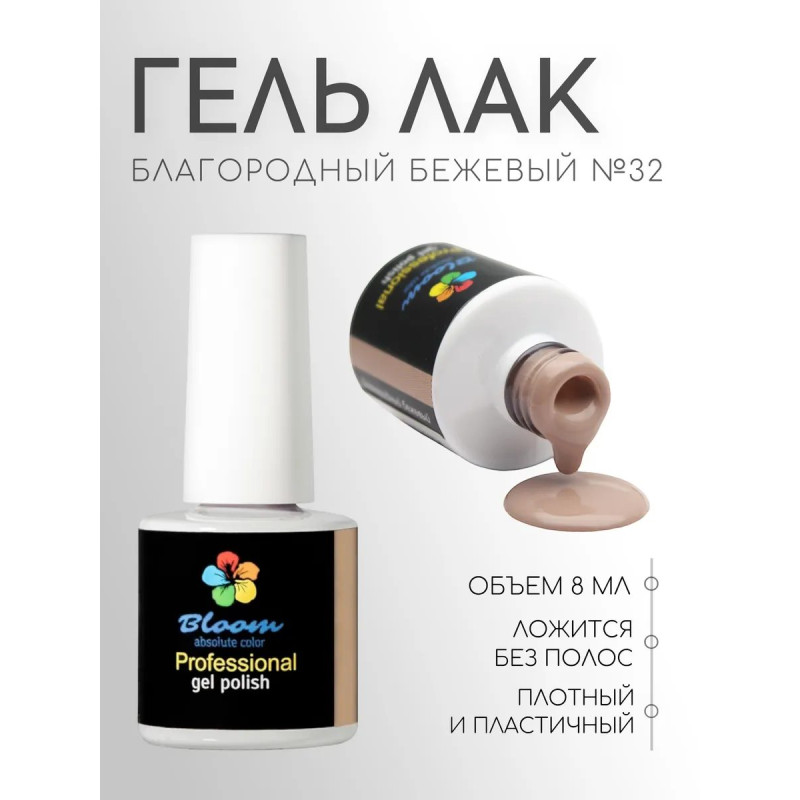 Гель-лак Bloom Благородный бежевый (№32) 8 мл. 90% оттенков имеют плотный стабильный пигмент. Каучуковая основа, пластичные. Сочетаются с базами и топами других фирм.