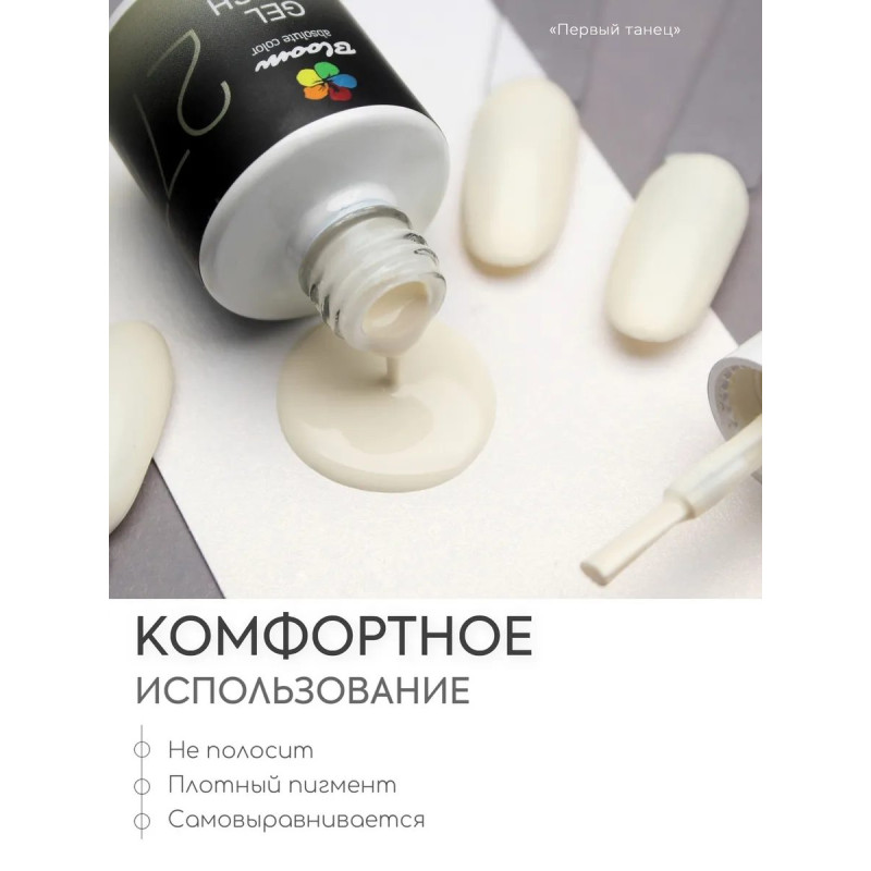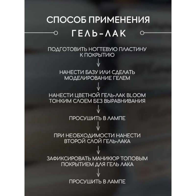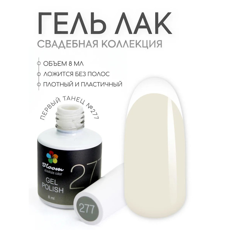 Гель-лак Bloom Первый танец (№277) 8 мл. 90% оттенков имеют плотный стабильный пигмент. Каучуковая основа, пластичные. Сочетаются с базами и топами других фирм. Средняя консистенция, не текут. Имеют остаточную липкость. Сушить в УФ 2 минуты, в ЛЕД 1 минуту.